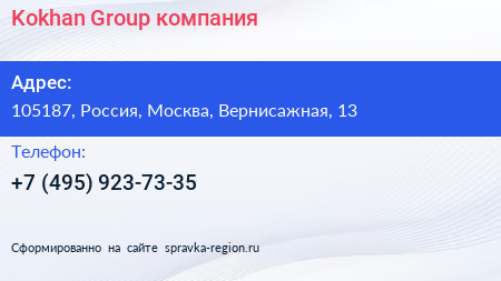 Kokhan Group, компания по адресу 105187, Россия, Москва, Вернисажная, 13 в дальнейшем Организация, размещена в следующих категориях:
