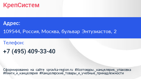 КрепСистем по адресу 109544, Россия, Москва, бульвар Энтузиастов, 2 в дальнейшем Организация, размещена в следующих категориях: