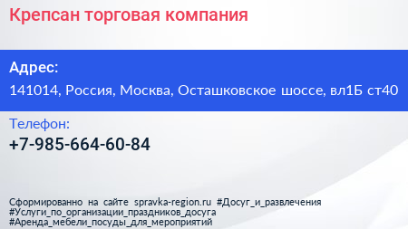 Крепсан, торговая компания по адресу 141014, Россия, Москва, Осташковское шоссе, вл1Б ст40 в дальнейшем Организация, размещена в следующих категориях: