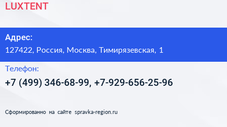 LUXTENT по адресу 127422, Россия, Москва, Тимирязевская, 1 в дальнейшем Организация, размещена в следующих категориях: