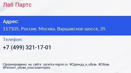 Лаб Партс по адресу 117105, Россия, Москва, Варшавское шоссе, 35 в дальнейшем Организация, размещена в следующих категориях: