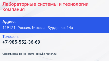 Лабораторные системы и технологии, компания по адресу 119121, Россия, Москва, Бурденко, 14а в дальнейшем Организация, размещена в следующих категориях: