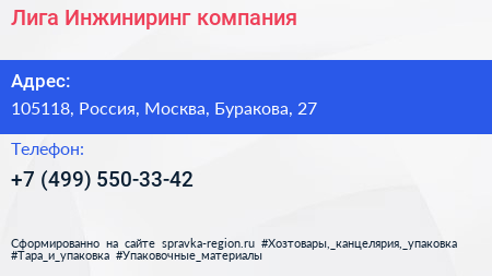 Лига Инжиниринг, компания по адресу 105118, Россия, Москва, Буракова, 27 в дальнейшем Организация, размещена в следующих категориях: