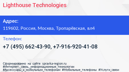 Lighthouse Technologies по адресу 119602, Россия, Москва, Тропарёвская, вл4 в дальнейшем Организация, размещена в следующих категориях: