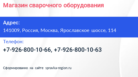 Магазин сварочного оборудования по адресу 141009, Россия, Москва, Ярославское шоссе, 114 в дальнейшем Организация, размещена в следующих категориях: