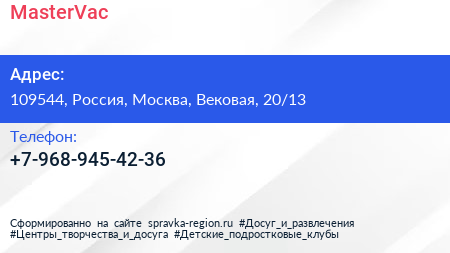 MasterVac по адресу 109544, Россия, Москва, Вековая, 20/13 в дальнейшем Организация, размещена в следующих категориях: