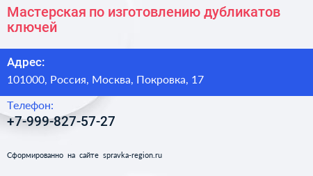Мастерская по изготовлению дубликатов ключей по адресу 101000, Россия, Москва, Покровка, 17 в дальнейшем Организация, размещена в следующих категориях: