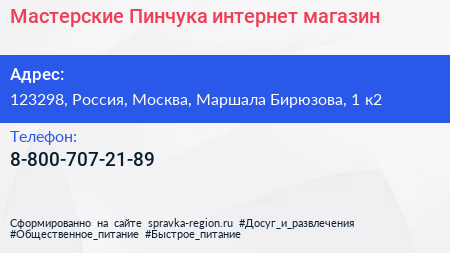 Мастерские Пинчука, интернет-магазин по адресу 123298, Россия, Москва, Маршала Бирюзова, 1 к2 в дальнейшем Организация, размещена в следующих категориях: