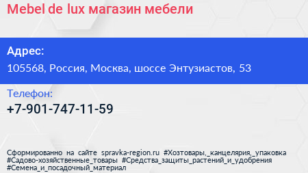 Mebel de lux, магазин мебели по адресу 105568, Россия, Москва, шоссе Энтузиастов, 53 в дальнейшем Организация, размещена в следующих категориях:
