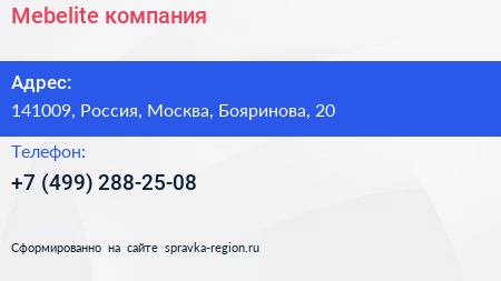 Mebelite, компания по адресу 141009, Россия, Москва, Бояринова, 20 в дальнейшем Организация, размещена в следующих категориях: