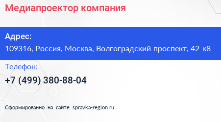 Медиапроектор, компания по адресу 109316, Россия, Москва, Волгоградский проспект, 42 к8 в дальнейшем Организация, размещена в следующих категориях: