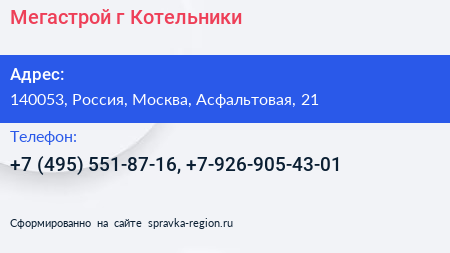 Мегастрой, г. Котельники по адресу 140053, Россия, Москва, Асфальтовая, 21 в дальнейшем Организация, размещена в следующих категориях: