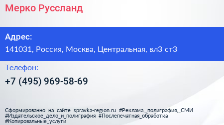 Мерко Руссланд по адресу 141031, Россия, Москва, Центральная, вл3 ст3 в дальнейшем Организация, размещена в следующих категориях: