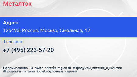 Металтэк по адресу 125493, Россия, Москва, Смольная, 12 в дальнейшем Организация, размещена в следующих категориях: