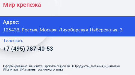 Мир крепежа по адресу 125438, Россия, Москва, Лихоборская Набережная, 3 в дальнейшем Организация, размещена в следующих категориях: