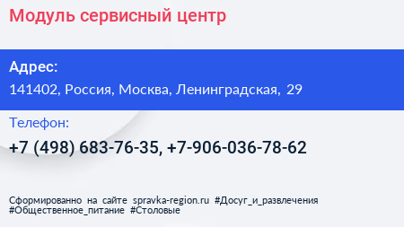 Модуль, сервисный центр по адресу 141402, Россия, Москва, Ленинградская, 29 в дальнейшем Организация, размещена в следующих категориях: