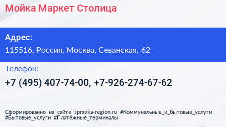 Мойка Маркет Столица по адресу 115516, Россия, Москва, Севанская, 62 в дальнейшем Организация, размещена в следующих категориях: