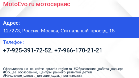 MotoEvo.ru, мотосервис по адресу 127273, Россия, Москва, Сигнальный проезд, 18 в дальнейшем Организация, размещена в следующих категориях: