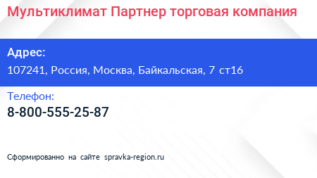 Мультиклимат Партнер, торговая компания по адресу 107241, Россия, Москва, Байкальская, 7 ст16 в дальнейшем Организация, размещена в следующих категориях: