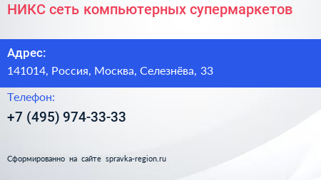 НИКС, сеть компьютерных супермаркетов по адресу 141014, Россия, Москва, Селезнёва, 33 в дальнейшем Организация, размещена в следующих категориях: