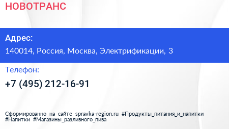 НОВОТРАНС по адресу 140014, Россия, Москва, Электрификации, 3 в дальнейшем Организация, размещена в следующих категориях:
