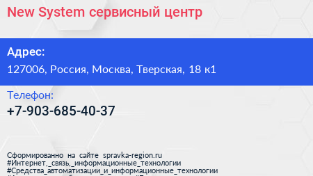 New-System, сервисный центр по адресу 127006, Россия, Москва, Тверская, 18 к1 в дальнейшем Организация, размещена в следующих категориях: