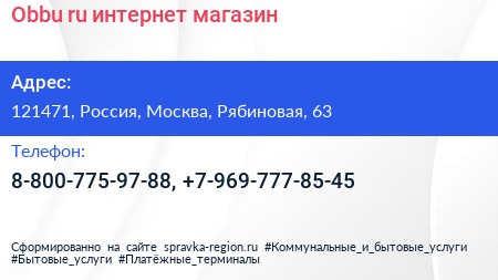 Obbu.ru, интернет-магазин по адресу 121471, Россия, Москва, Рябиновая, 63 в дальнейшем Организация, размещена в следующих категориях: