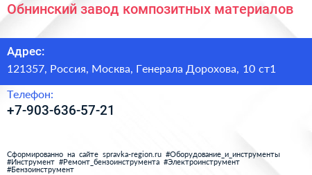 Обнинский завод композитных материалов по адресу 121357, Россия, Москва, Генерала Дорохова, 10 ст1 в дальнейшем Организация, размещена в следующих категориях:
