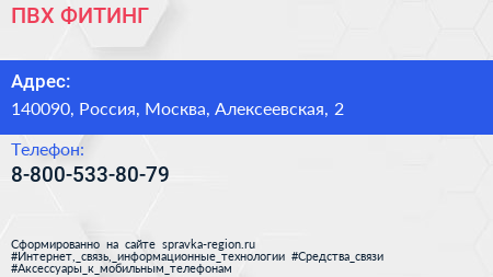 ПВХ ФИТИНГ по адресу 140090, Россия, Москва, Алексеевская, 2 в дальнейшем Организация, размещена в следующих категориях: