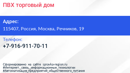 ПВХ, торговый дом по адресу 115407, Россия, Москва, Речников, 19 в дальнейшем Организация, размещена в следующих категориях: