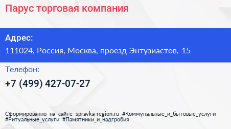 Парус, торговая компания по адресу 111024, Россия, Москва, проезд Энтузиастов, 15 в дальнейшем Организация, размещена в следующих категориях: