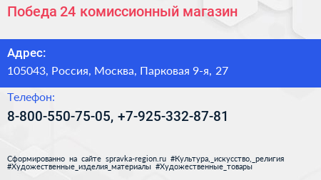 Победа 24, комиссионный магазин по адресу 105043, Россия, Москва, Парковая 9-я, 27 в дальнейшем Организация, размещена в следующих категориях: