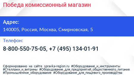 Победа, комиссионный магазин по адресу 140005, Россия, Москва, Смирновская, 5 в дальнейшем Организация, размещена в следующих категориях: