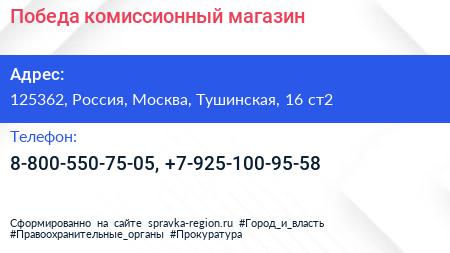 Победа, комиссионный магазин по адресу 125362, Россия, Москва, Тушинская, 16 ст2 в дальнейшем Организация, размещена в следующих категориях:
