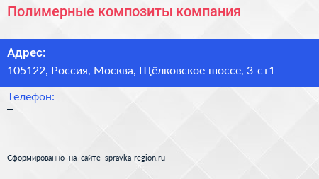 Полимерные композиты, компания по адресу 105122, Россия, Москва, Щёлковское шоссе, 3 ст1 в дальнейшем Организация, размещена в следующих категориях: