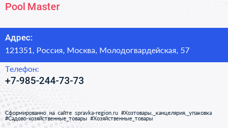 Pool Master по адресу 121351, Россия, Москва, Молодогвардейская, 57 в дальнейшем Организация, размещена в следующих категориях: