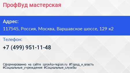 ПрофВуд, мастерская по адресу 117545, Россия, Москва, Варшавское шоссе, 129 к2 в дальнейшем Организация, размещена в следующих категориях:
