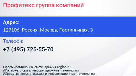 Профитекс, группа компаний по адресу 127106, Россия, Москва, Гостиничная, 3 в дальнейшем Организация, размещена в следующих категориях: