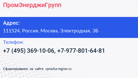 ПромЭнерджиГрупп по адресу 111524, Россия, Москва, Электродная, 3Б в дальнейшем Организация, размещена в следующих категориях: