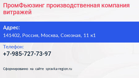 ПромФьюзинг, производственная компания витражей по адресу 141402, Россия, Москва, Союзная, 11 к1 в дальнейшем Организация, размещена в следующих категориях: