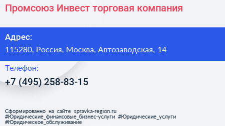 Промсоюз-Инвест, торговая компания по адресу 115280, Россия, Москва, Автозаводская, 14 в дальнейшем Организация, размещена в следующих категориях: