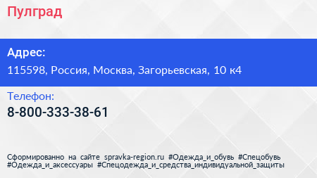 Пулград по адресу 115598, Россия, Москва, Загорьевская, 10 к4 в дальнейшем Организация, размещена в следующих категориях: