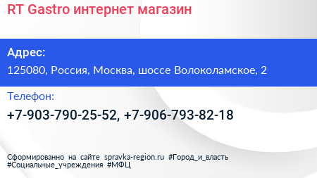 RT Gastro, интернет-магазин по адресу 125080, Россия, Москва, шоссе Волоколамское, 2 в дальнейшем Организация, размещена в следующих категориях: