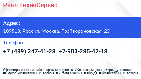 Реал ТехноСервис по адресу 109518, Россия, Москва, Грайвороновская, 23 в дальнейшем Организация, размещена в следующих категориях: