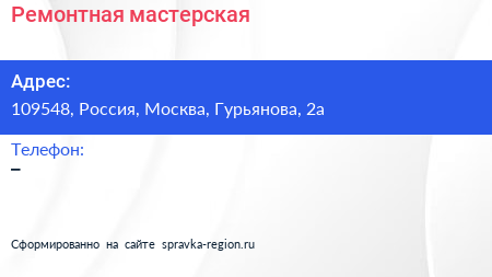 Ремонтная мастерская по адресу 109548, Россия, Москва, Гурьянова, 2а в дальнейшем Организация, размещена в следующих категориях: