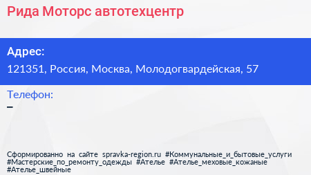 Рида Моторс, автотехцентр по адресу 121351, Россия, Москва, Молодогвардейская, 57 в дальнейшем Организация, размещена в следующих категориях: