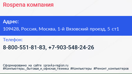 Rospena, компания по адресу 109428, Россия, Москва, 1-й Вязовский проезд, 5 ст1 в дальнейшем Организация, размещена в следующих категориях: