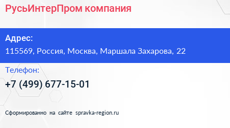 РусьИнтерПром, компания по адресу 115569, Россия, Москва, Маршала Захарова, 22 в дальнейшем Организация, размещена в следующих категориях: