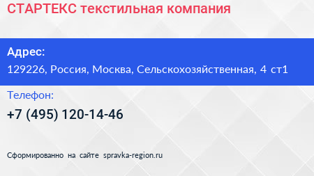 СТАРТЕКС, текстильная компания по адресу 129226, Россия, Москва, Сельскохозяйственная, 4 ст1 в дальнейшем Организация, размещена в следующих категориях: