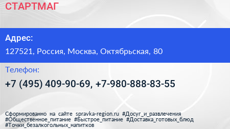 СТАРТМАГ по адресу 127521, Россия, Москва, Октябрьская, 80 в дальнейшем Организация, размещена в следующих категориях: